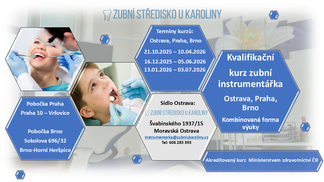 Společnost Zubní středisko u Karoliny, s.r.o. pořádá akreditovaný kvalifikační kurz Zubní instrumentářka v kombinované formě akreditovaný Ministerstvem zdravotnictví ČR č. j.: MZDR 22105/2022-8/ONP a č.j.: MZDR 12466/2023-6/ONP